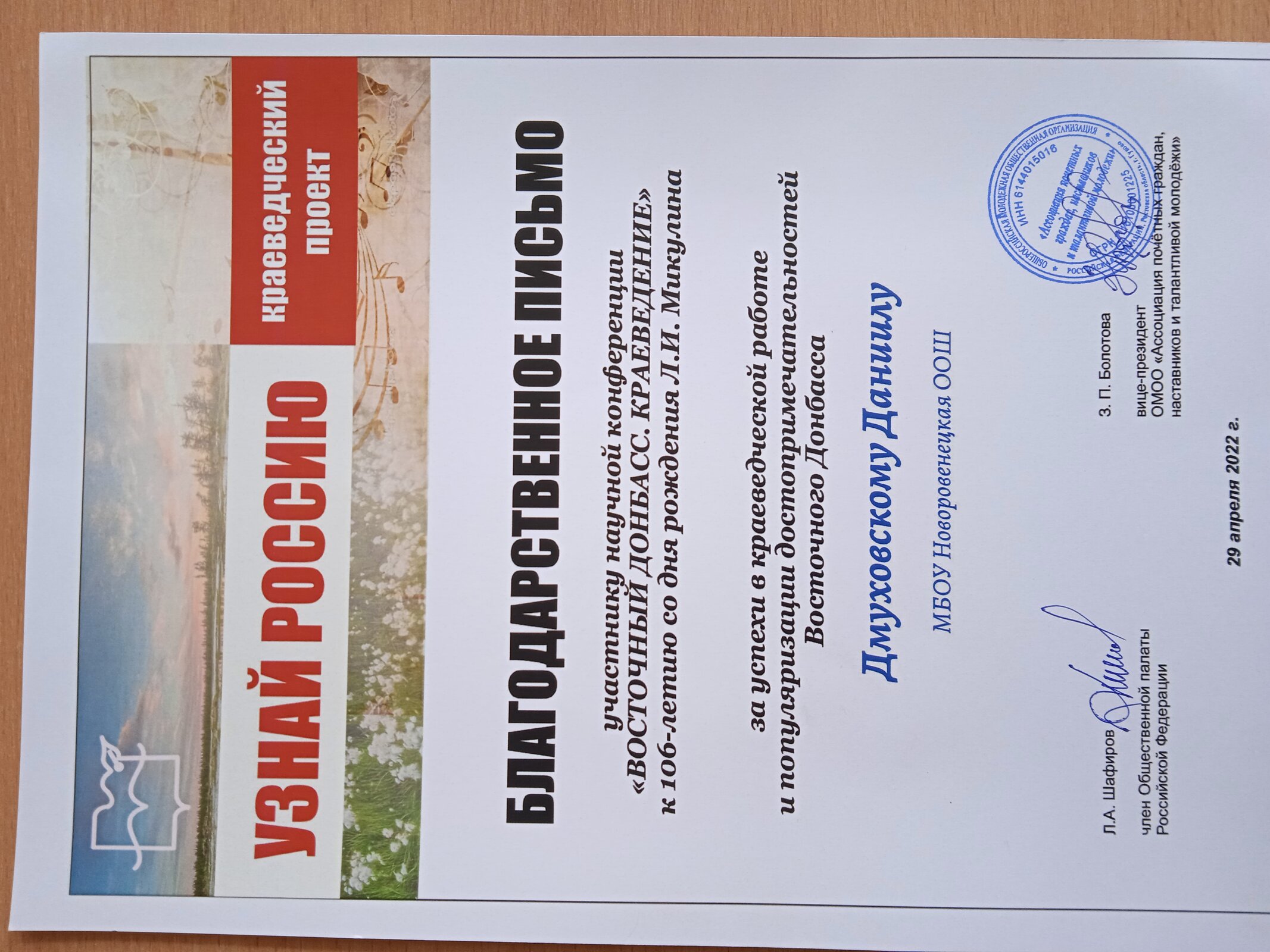29 апреля 2022г. в городе Гуково проходила конференция «ВОСТОЧНЫЙ ДОНБАСС.КРАЕВЕДЕНИЕ» к 106-летию со дня рождения Л.И. Мукулина. От нашей школы принимал участие ученик 8 класса Дмуховский Даниил.